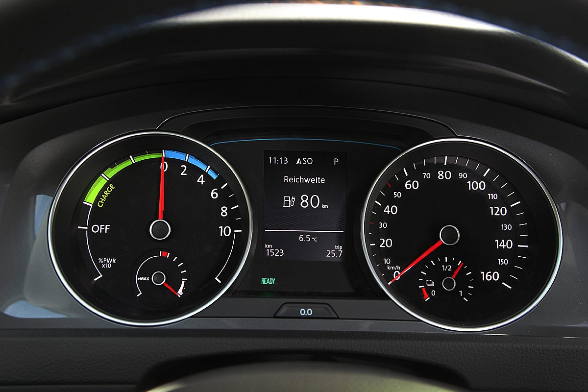 On the outside, the only telltale signs that this Golf VII is battery-powered are the covered upper and the reshaped lower grilles, along with the mildly modified head- and tail-lamps, while inside, VW replaced the tachometer and the two smaller gauges in the instrument panel with new meters providing relevant information. The LCD screen of the infotainment system was also updated accordingly.